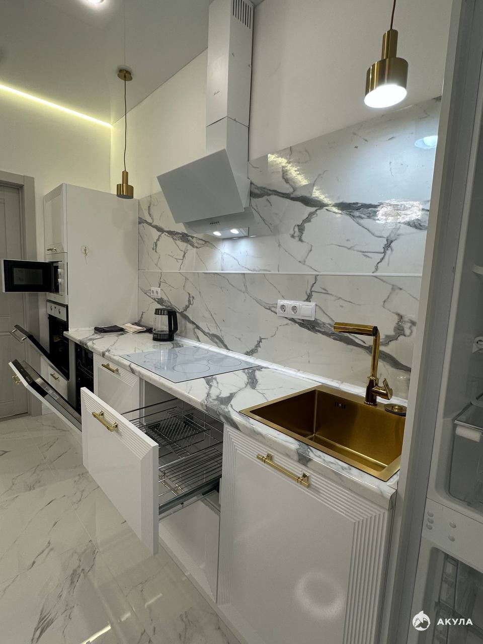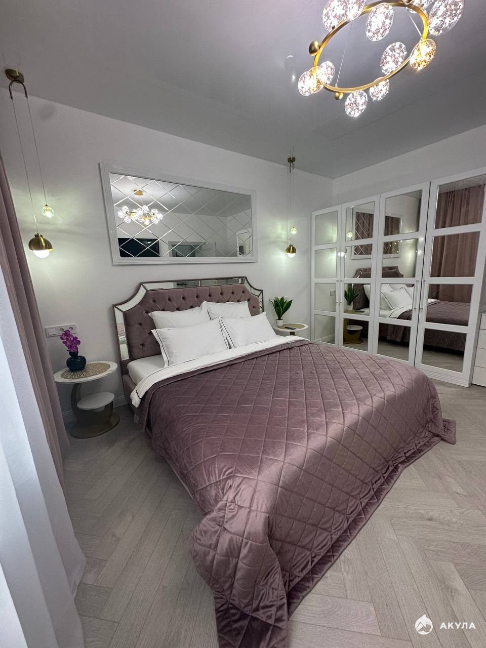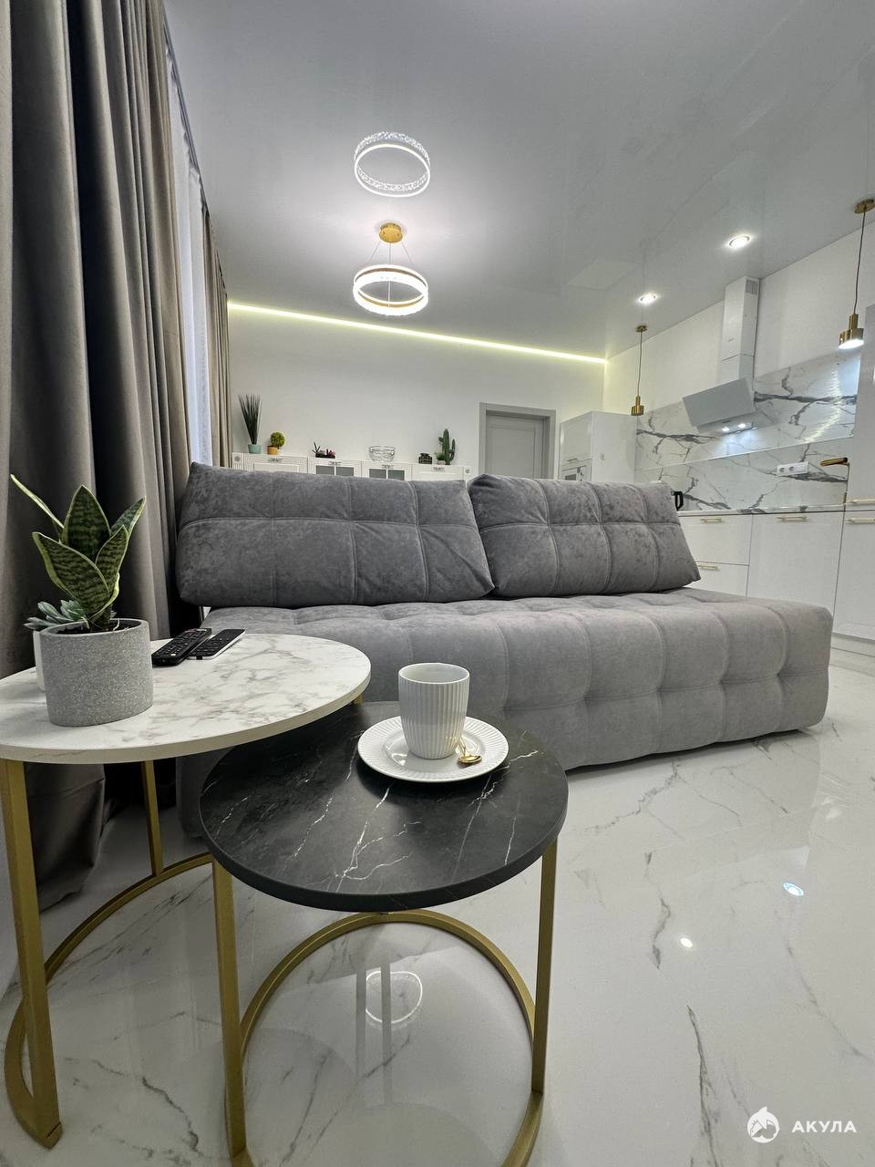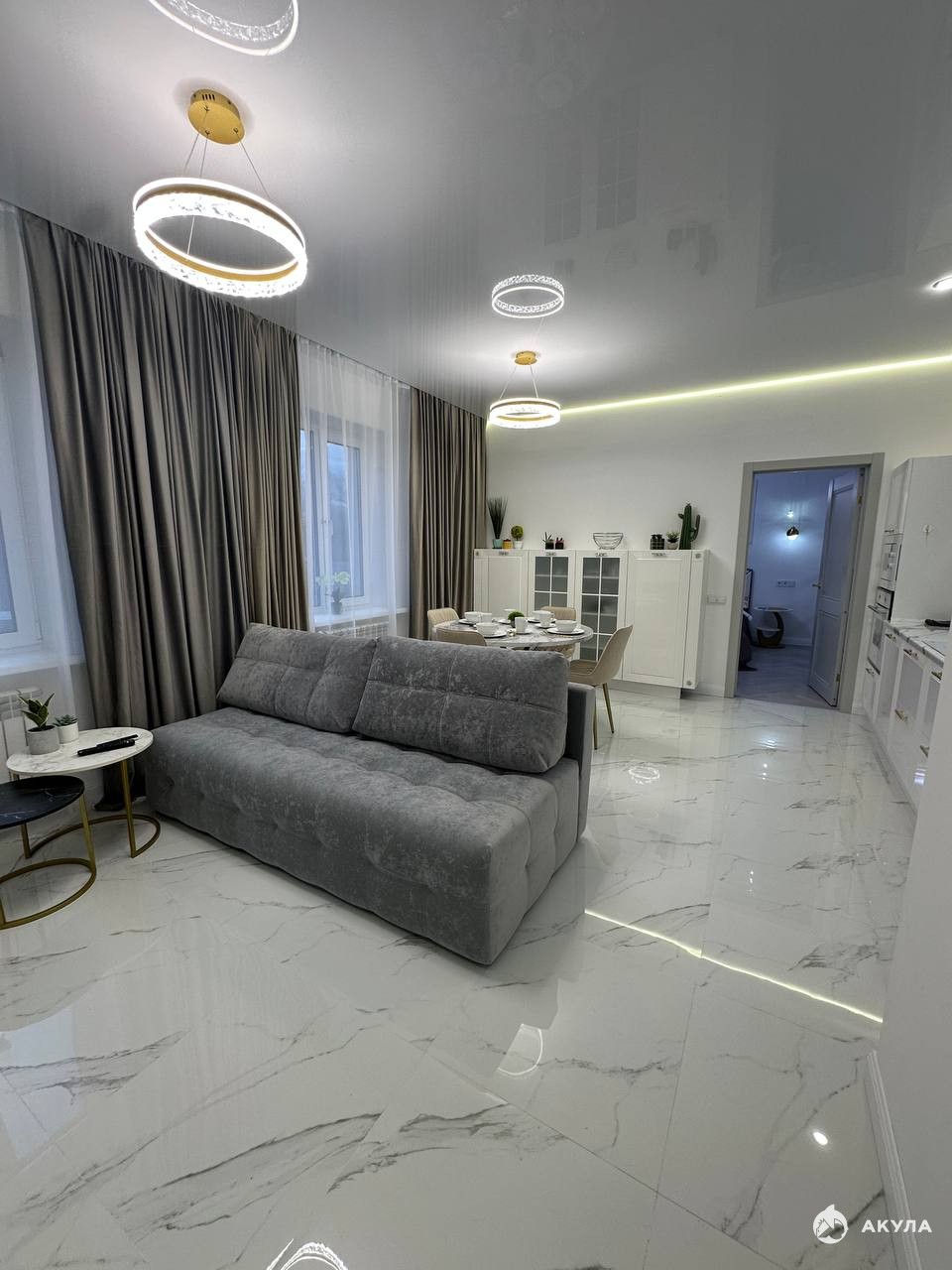 современный двухспальный мягкий диван, вместительные шкафы, обеденный стол на 4 персоны, мягкие стулья, современный дизайнерский кухонный гарнитур со всей встроенной техникой, стильное освещение и интерьерные детали, создающие атмосферу уюта.